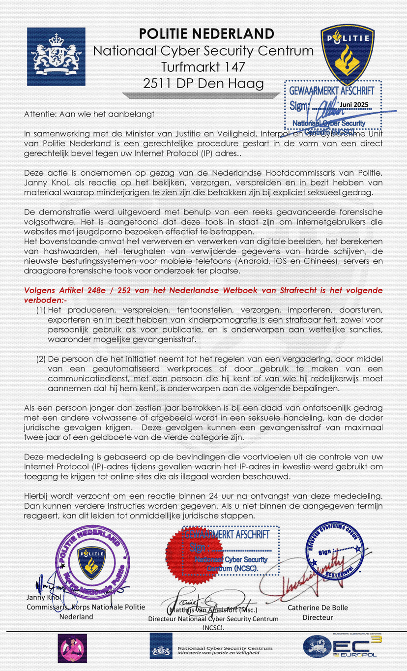 Wij ontvangen berichten dat mensen nepmails ontvangen vanuit o.a. het NCSC uit naam van onze directeur Matthijs van Amelsfort. De mails bevatten een nep-dagvaarding en maken onderdeel uit van een phishingcampagne. Wanneer je deze mail ontvangt, verwijder deze dan direct en maak melding bij de Fraudehelpdesk. Er wordt onderzoek gedaan naar de herkomst van de mail. Het NCSC neemt nooit contact op met burgers.