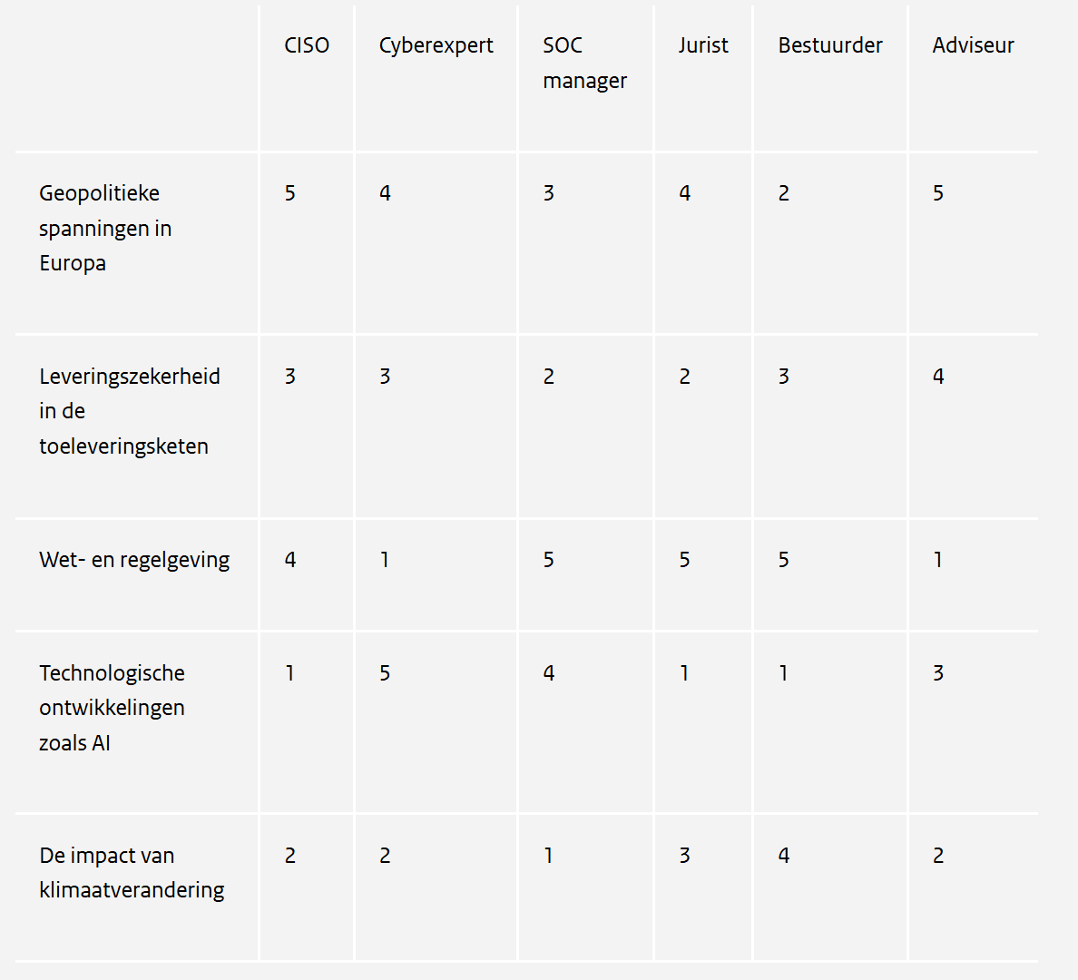 In ons voorbeeld wil de CISO inzicht creëren in de ontwikkelingen die mogelijk de digitale weerbaarheid van de sector beïnvloeden. Daardoor kan hij de beleidsmakers binnen zijn organisatie in staat stellen om in te zien welke middelen vrij gemaakt dienen te worden om de organisatie goed voor te bereiden op deze veranderingen.