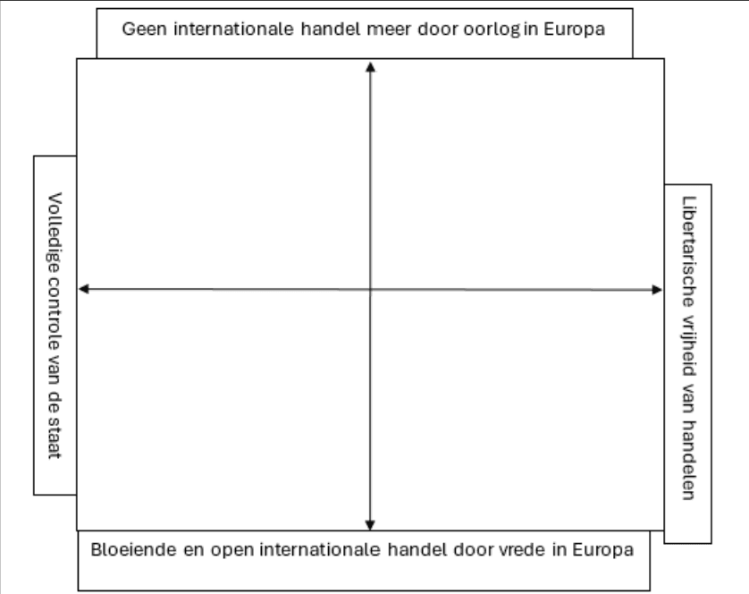 4. Bepaal voor elke van de twee drijfveren, wat de twee uitersten. De uitersten van “conflict” zijn: oorlog versus vrede. Let op dat je de extremen noteert: “weinig conflict” is geen uitkomst.