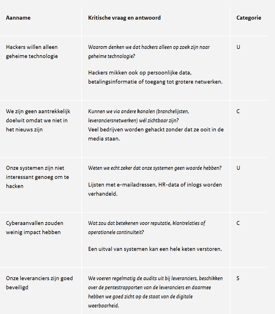 Een nieuwe aanname kan zijn: "Hackers kunnen ons gebruiken als toegang tot beter beveiligde partners." Een aangepaste aanname kan zijn: “We zijn niet zichtbaar in het nieuws, maar wel in bepaalde branchelijsten.”