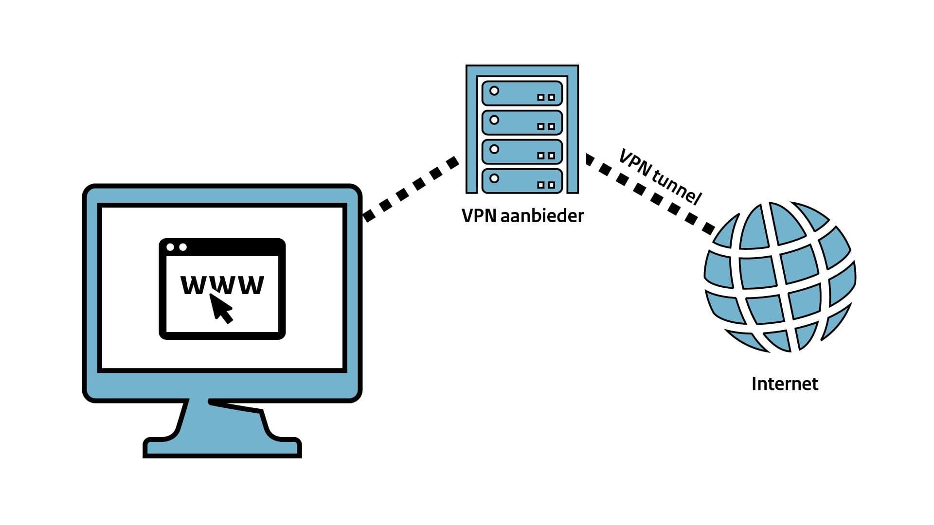 Een VPN-dienst afnemen bij een aanbieder kan hier een oplossing zijn. Zo’n dienst zorgt ervoor dat jij met jouw apparaat een VPN-tunnel kan opzetten naar een VPN-server van de aanbieder. Vervolgens wordt al het dataverkeer eerst door deze versleutelde VPN-tunnel gestuurd voordat je het internet op gaat. De VPN-server zorgt ervoor dat je via een ander IP-adres het daadwerkelijke internet op gaat. Hierdoor is het voor anderen veel moeilijker om jou te identificeren.
