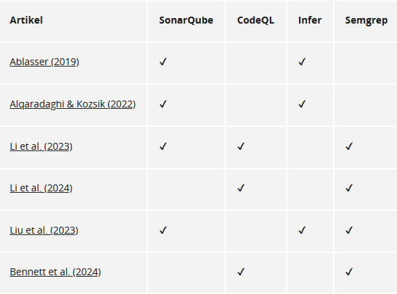 De meeste onderzoeken vergelijken tussen de 5 á 10 verschillende tools. Voor mijn literatuuronderzoek heb ik alleen onderzoeken geselecteerd waarin minstens twee van de vier eerder genoemde tools (SonarQube, CodeQL, Infer, Semgrep) zijn meegenomen.
