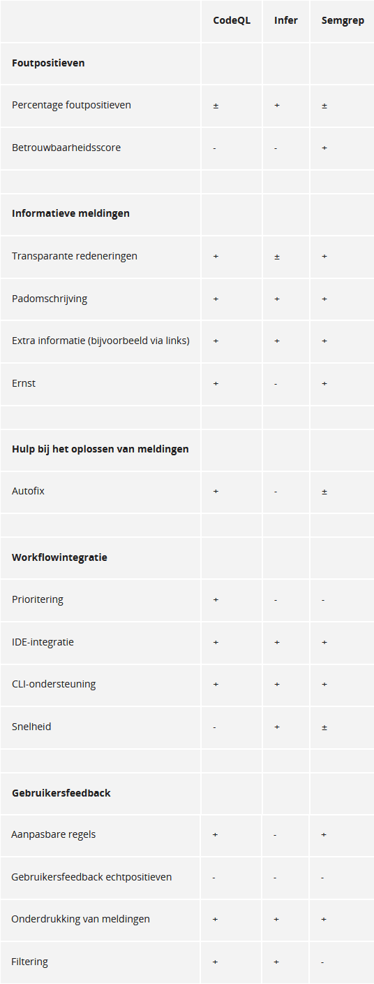 Deze obstakels heb ik onderverdeeld in subobstakels. Voor elk subobstakel heb ik handmatig beoordeeld in hoeverre de drie nieuwe tools (CodeQL, Infer en Semgrep OSS) dit probleem aanpakken. Zie onderstaande tabel voor een volledig overzicht, waarbij de beoordeling al volgt is gecodeerd: