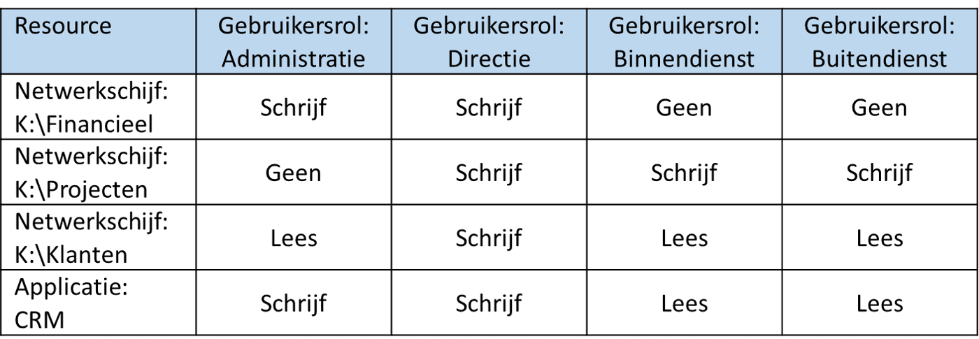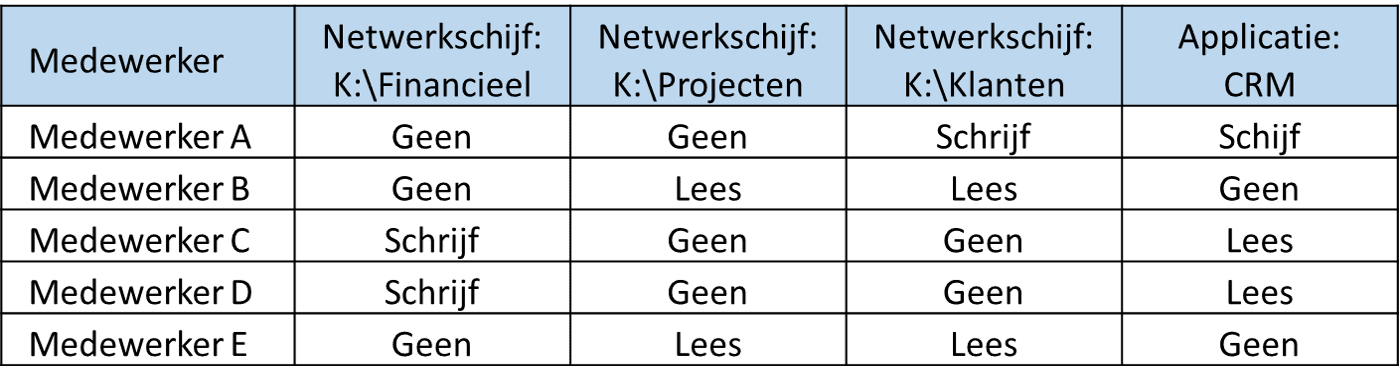 In het volgende voorbeeld tonen de kolommen de resources binnen de organisatie en kan per medewerker worden aangegeven of een medewerker lees- of schrijfrechten heeft. In dit voorbeeld betekent schijfrechten automatisch ook leesrechten.
