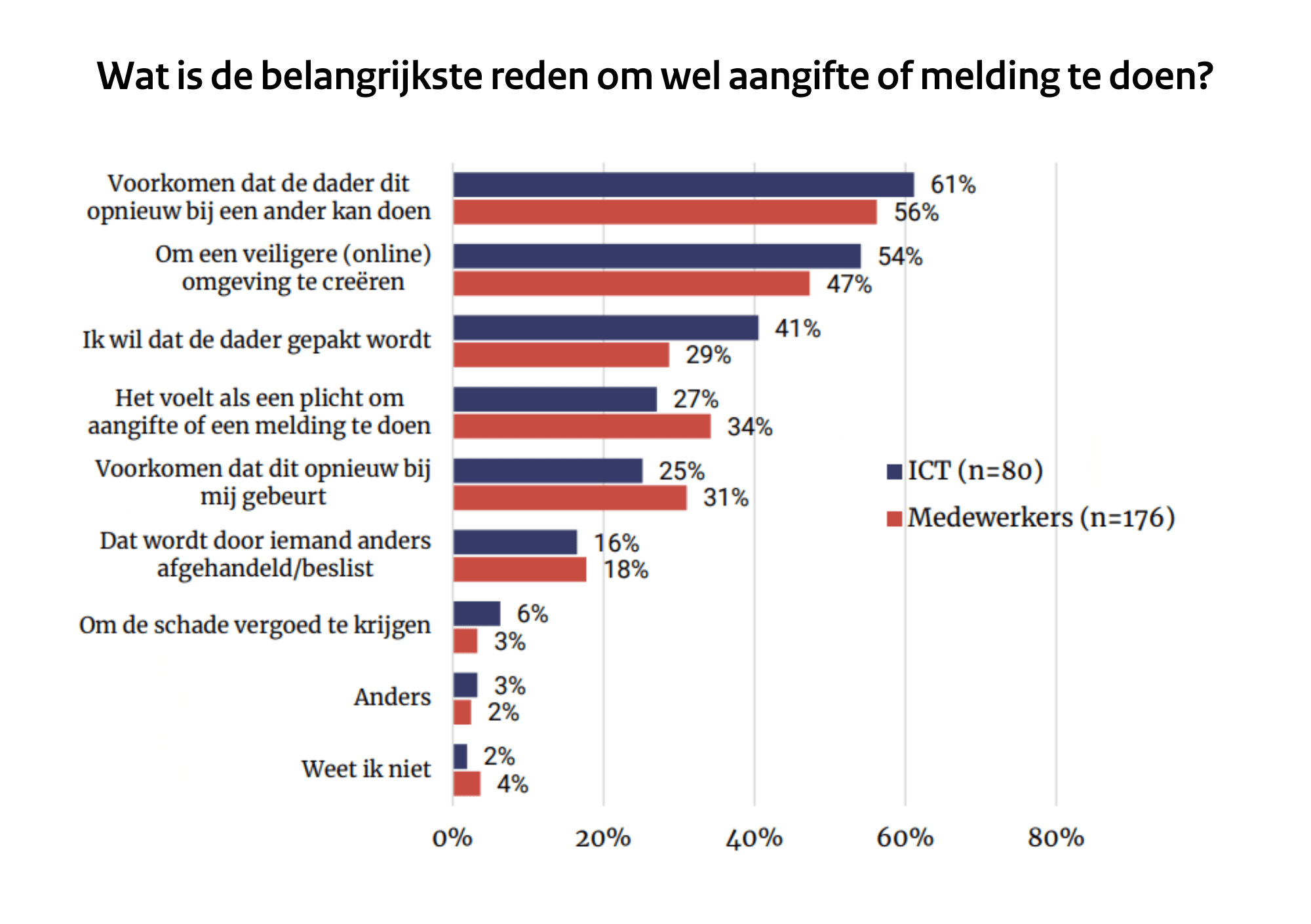 De meerderheid van alle ICT-verantwoordelijken doet geen melding of aangifte nadat men te maken kreeg met cybercriminaliteit in de werksituatie. Argumenten om geen aangifte te doen zijn dat het te veel moeite is, dat het geen zin heeft of dat er geen schade is ondervonden. De meest melding wordt gedaan bij de ICT-afdeling. Als een melding wordt gedaan, is dit hoofdzakelijk om te voorkomen dat de dader dit opnieuw bij een ander doet. Zes op de tien medewerkers willen met het doen van een melding of aangifte voorkomen dat de dader meer slachtoffers kan maken.