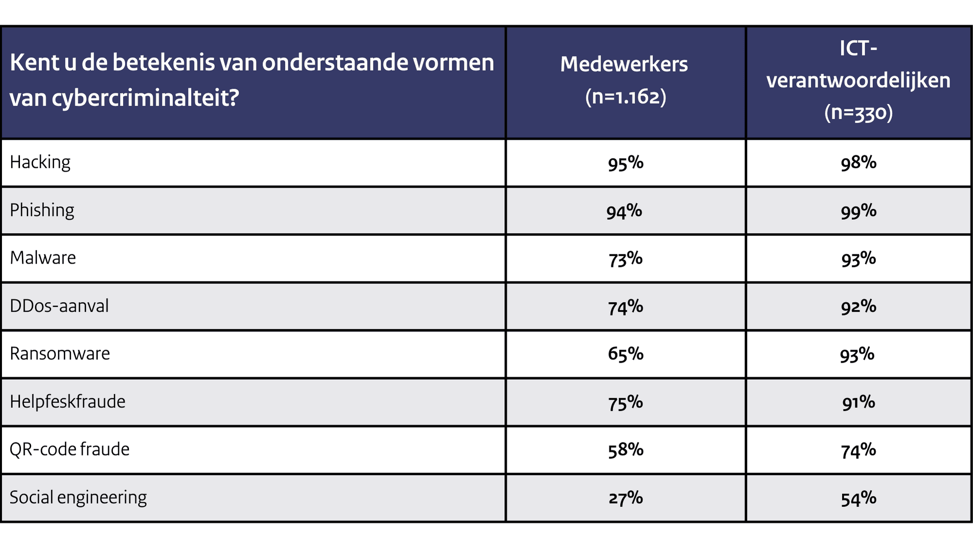 Er is een duidelijk verschil te zien in de bekendheid van cybersecuritytermen tussen reguliere medewerkers en ICT-verantwoordelijken. Van alle voorgelegde vormen van cybercrime is social engineering zowel bij medewerkers als ICT-verantwoordelijken het minst bekend. Phishing is bij bijna alle (99%) ICT-verantwoordelijken en medewerkers (94%) een bekende term.