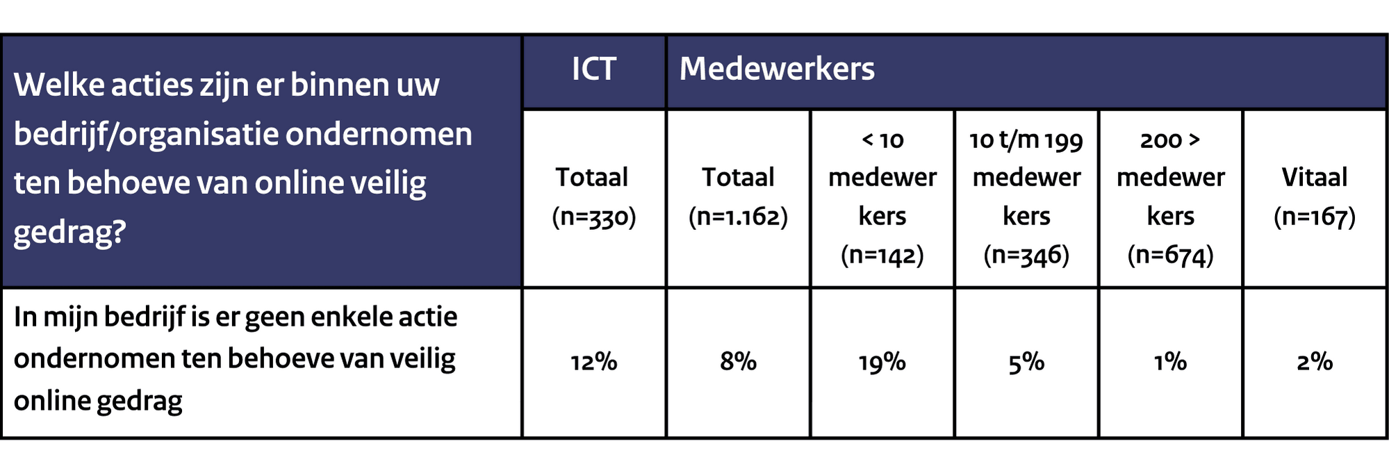 Over het algemeen geldt voor elke cybermaatregel dat organisaties met meer werknemers meer acties ondernemen ten behoeve van online veilig gedrag dan organisaties met minder werknemers. Maar liefst 19% van de kleine bedrijven neemt geen enkele actie om veilig online te zijn. Medewerkers van kleine bedrijven geven aan dat ze naar verhouding minder toegang hebben tot goede tools en instrumenten om hun veilig online gedrag te verbeteren. Kijkend naar specifieke maatregelen dan blijkt dat inloggen in twee stappen de meest genomen actie is. Bijna de helft van de grote bedrijven past deze cybermaatregel toe. Opvallend is dat drie op de tien medewerkers niet weten welke cybermaatregelen de eigen organisatie genomen heeft.