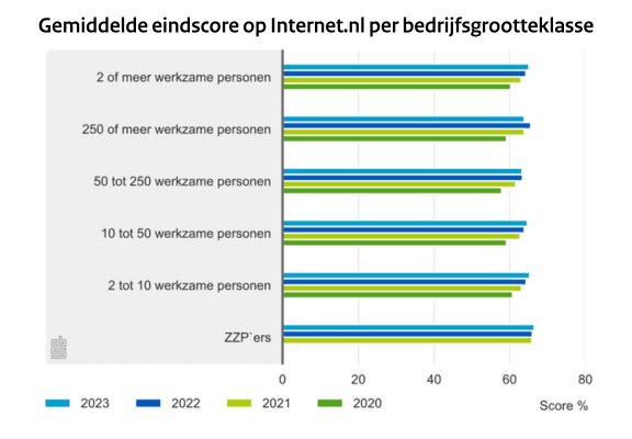De gemiddelde eindscore per bedrijfsgrootte is voor alle bedrijfsgrootteklassen ongeveer gelijk en neemt met de tijd gestaag toe. In de Cybersecuritymonitorwordt geconstateerd dat kleine bedrijven vaak minder maatregelen treffen dan grote bedrijven om hun ICT-systemen te beveiligen, maar bij het toepassen van internetstandaarden valt het op dat kleine bedrijven het even goed, zo niet beter, doen dan grote bedrijven.