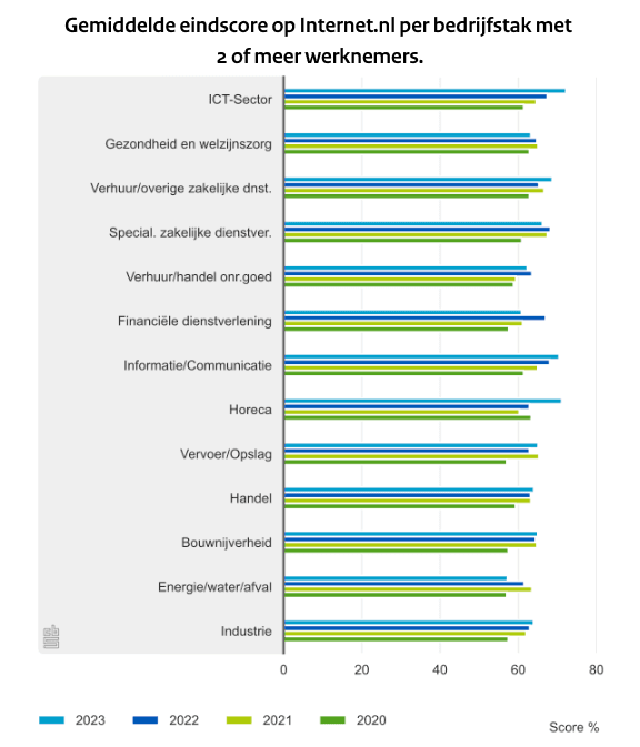 De scores op Internet.nl worden bepaald op basis van verschillende standaarden. Zo wordt er onder meer gekeken naar beveiligingsopties, het toepassen van een domeinnaamhandtekening (DNSSEC), HTTPS, en het gebruik van IPv6. Uit het onderzoek blijkt dat kleine bedrijven relatief goed scoren op de categorie IPv6. Ook de ICT-sector heeft het ondersteunen van IPv6 goed op orde, in 2023 slaagt ruim 55% van alle bedrijven in deze sector voor deze categorie.