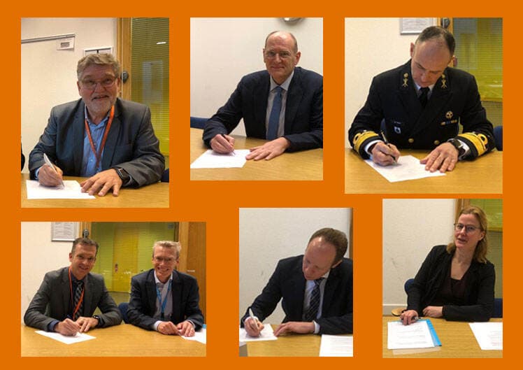 Namens de NRN-partners hebben het convenant ondertekend: Hugo Aalders (IBD), Wouter Bronsgeest, (Belastingdienst), Floor Jas (SURF), Arie Jan de Waard (Defensie), Perry van der Weyden (Rijkswaterstaat) en Hans de Vries (NCSC).