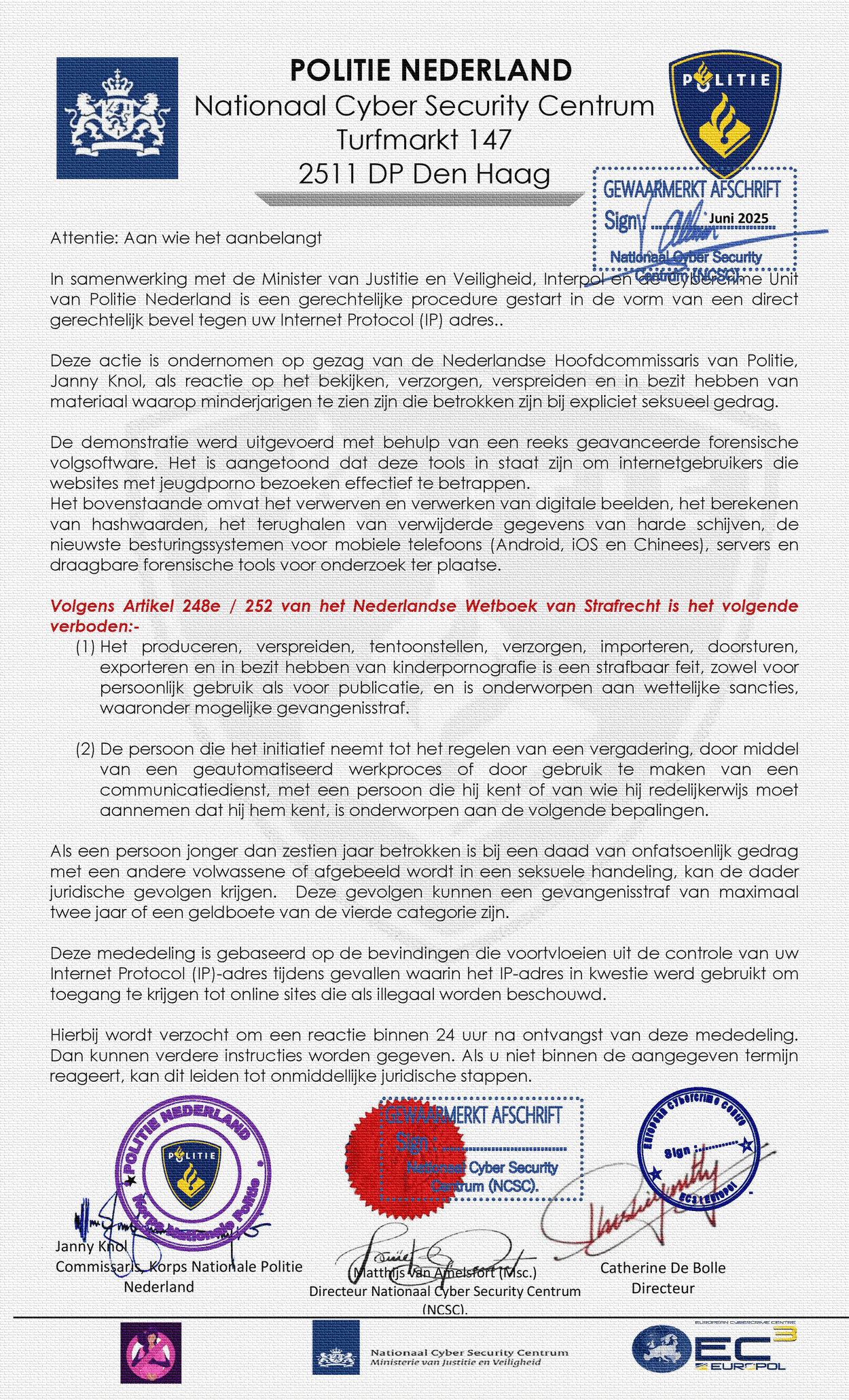 Wij ontvangen berichten dat mensen nepmails ontvangen vanuit het NCSC uit naam van onze directeur Matthijs van Amelsfort. De mails bevatten een nep-dagvaarding en maken onderdeel uit van een phishingcampagne. Wanneer je deze mail ontvangt, verwijder deze dan direct en maak melding bij de Fraudehelpdesk. Er wordt onderzoek gedaan naar de herkomst van de mail. Het NCSC neemt nooit contact op met burgers.
