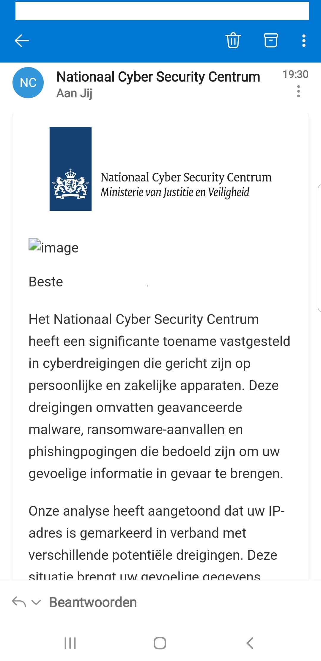 Het NCSC heeft berichten ontvangen dat mensen per e-mail zijn benaderd door het Nationaal Cyber Security Centrum (NCSC) waarin wordt opgeroepen tot het activeren van een antivirusoplossing. Deze e-mails maken deel uit van een phishingcampagne. In algemene zin neemt het NCSC geen contact op met burgers over digitale dreigingen en antivirusoplossingen.