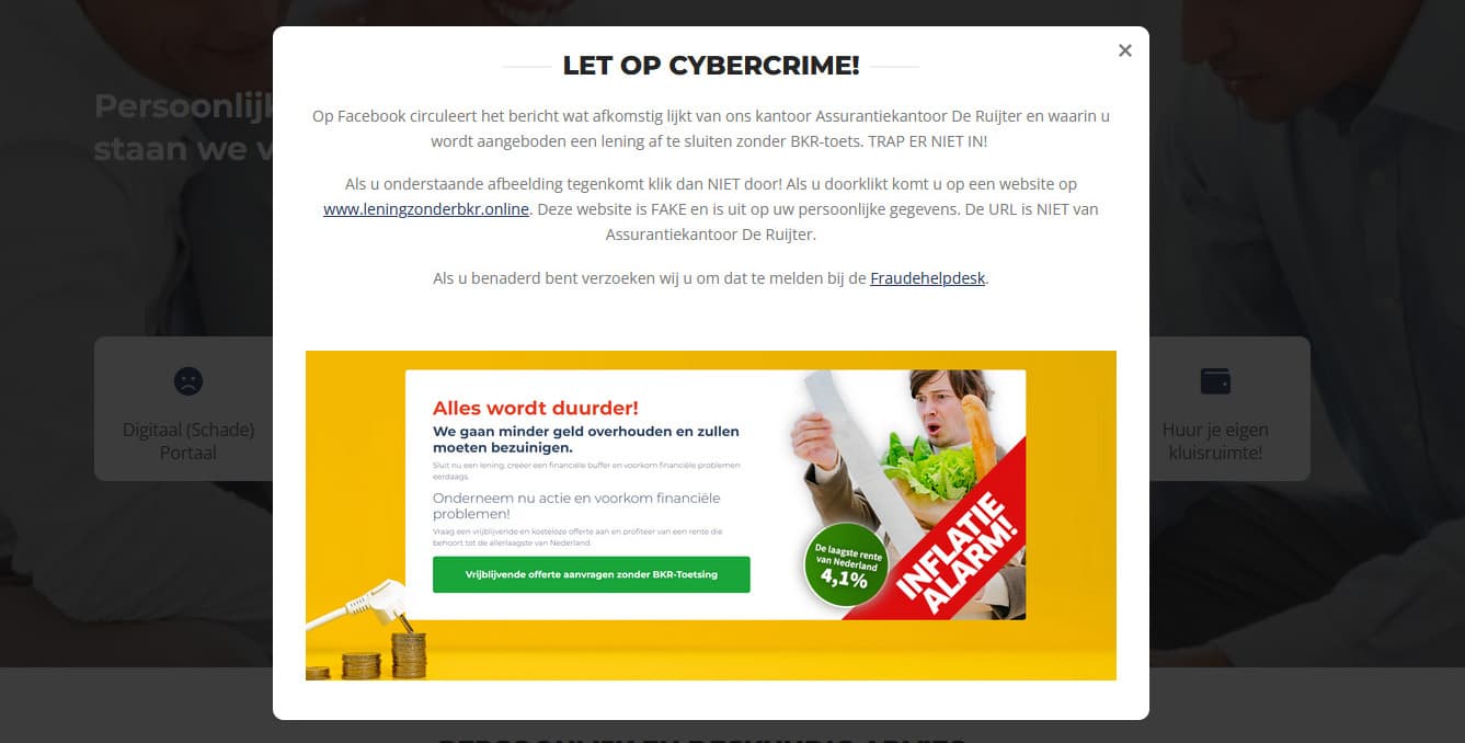 De slachtoffers zijn allemaal op dezelfde manier erin getuind. Ze krijgen via Facebook of andere social media een advertentie te zien met de tekst: “Snel een lening aanvragen, zonder BKR-toets.” Vervolgens worden ze naar een nepwebsite geleid waar ze hun gegevens kunnen achterlaten. Daarna worden ze gebeld door iemand die zich voordoet als medewerker van Financieel Adviesbureau De Ruyter, met een Griekse ij in plaats van een lange ij. Edwin: “Niet alleen de naam van het nepbedrijf lijkt op dat van ons. Ook het adres is bijna hetzelfde: Lindegracht. Wij zitten aan het Lindeplein.”